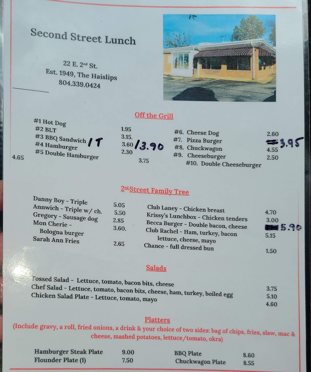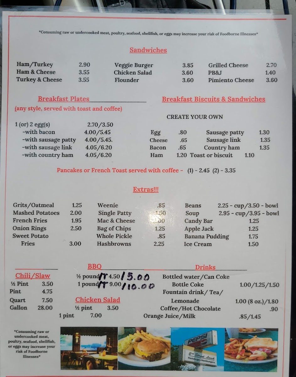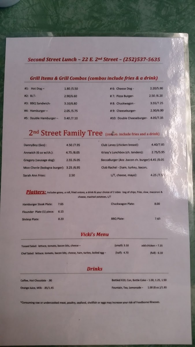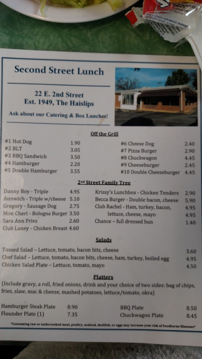 At Second Street Lunch, located at 22 E 2nd St, Roanoke Rapids, NC, the menu offers a variety of delicious options for every taste. If you're in the mood for a hearty meal, their Platters are a great choice, including the savory Hamburger Steak Plate and Flounder Plate, both sure to satisfy. The BBQ Plate and Chuckwagon Plate provide a flavorful, filling option for those craving classic Southern comfort food.